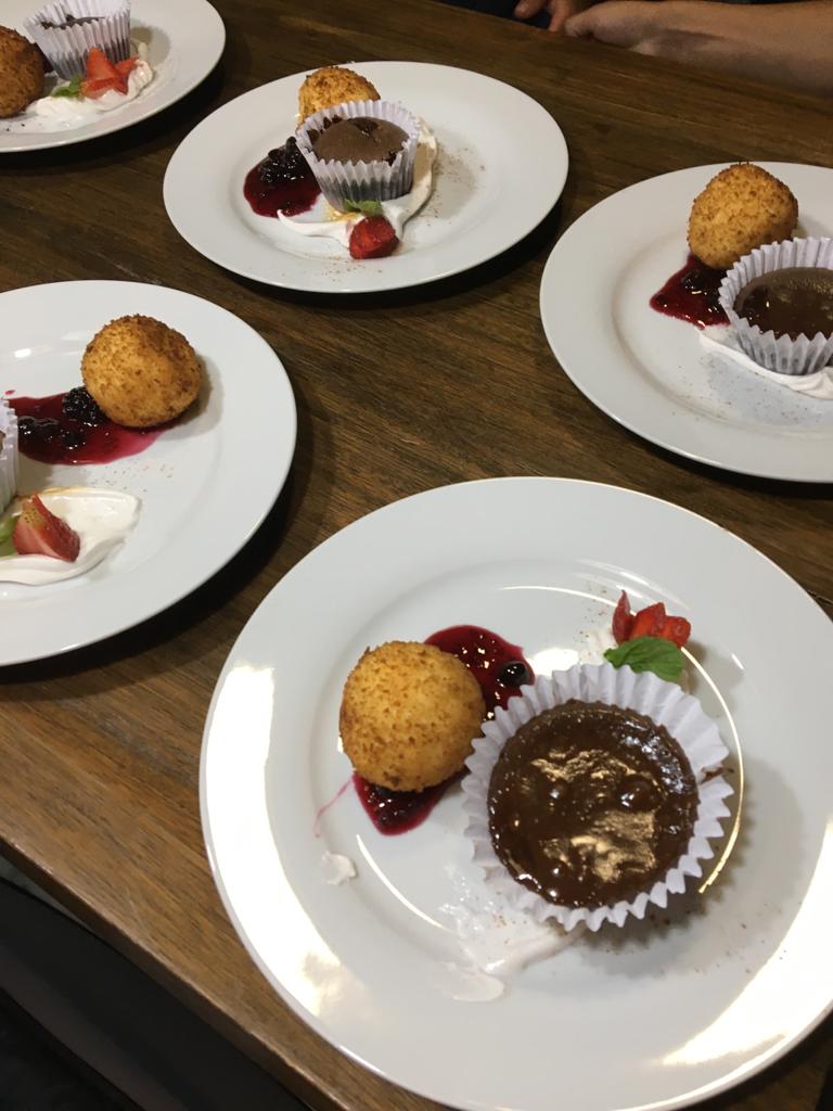 - Postre: Helado Crocante con salsa de frutos rojos + Volcán de chocolate